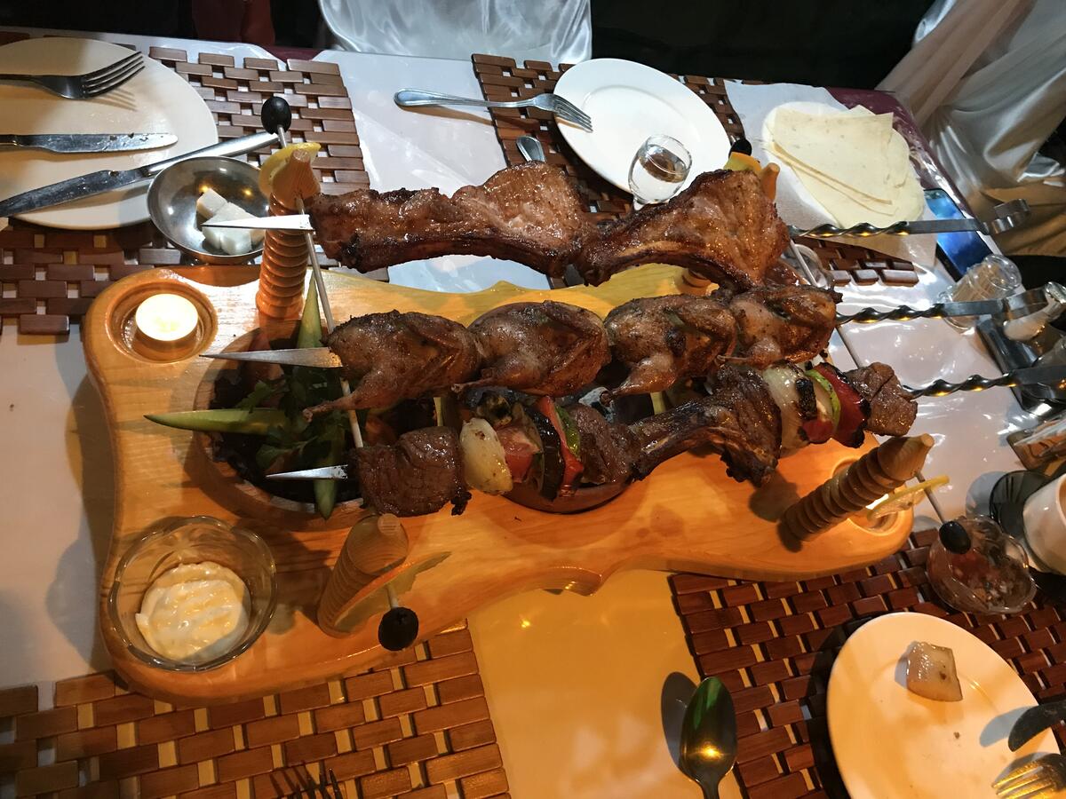 Кухня впечатлила, особенно изысканная подача шашлыка. Перепёлка-всем советую попробовать, а в купе с овощами - это просто песня. Салат новый в меню порадовал, с имбирём. Насыщает и освежаем одновременно. Закуска из баклажан, советую однозначно! Порадовали перемены в сервировке блюд и сам ассортимент. И отдельное спасибо за живую музыку!