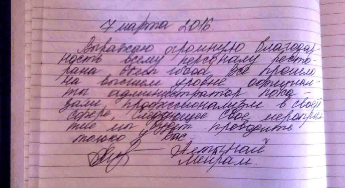 Здравствуйте, 7 марта провели банкет - юбилей на 90 человек. Все прошло отлично. Сервис был на высшем уровне. Приветливый персонал, особенно порадовали своим профессионализмом официанты и администратор Аслан. В июне месяце намечается еще одно мероприятие и уже знаю где провести свой банкет. С уважением, Ваши клиенты Алтынай и Мейрам.