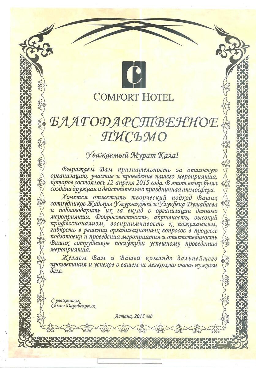 Желаем Вам процветания! Прилагаю благодарственное письмо за отлично проведенное мероприятие.